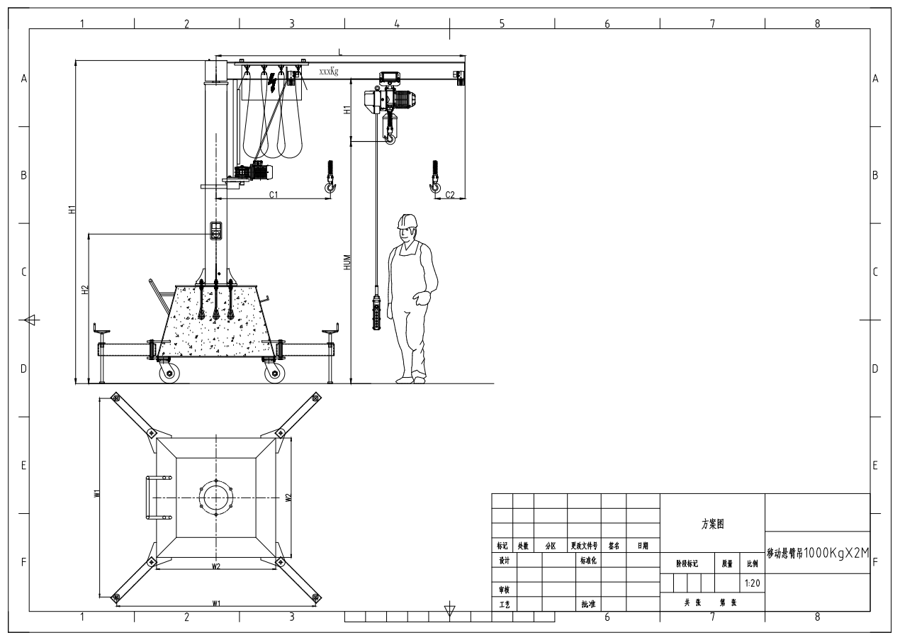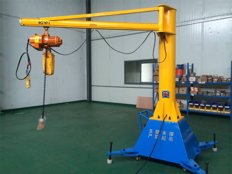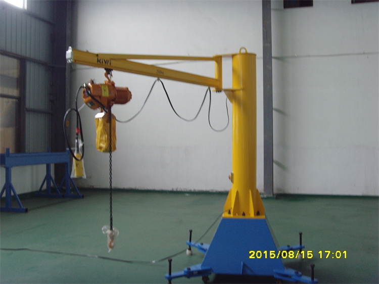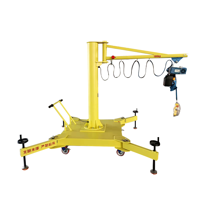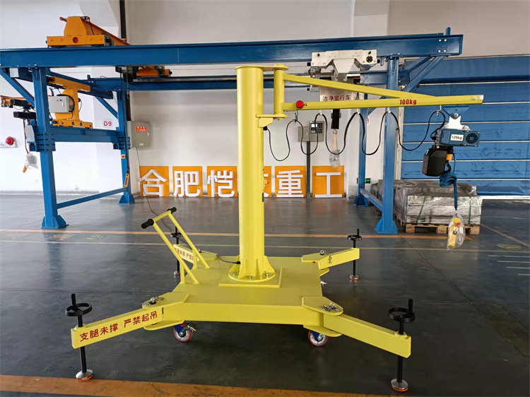 設(shè)備最大起重量為1000kg,最大臂長為4米,旋轉(zhuǎn)角度為360°,配重底座帶有伸縮支腿,起吊時(shí)打開支腿,增加設(shè)備穩(wěn)定性,移動時(shí)支腿收回,可減少設(shè)備體積,底座下端配四只可轉(zhuǎn)向車輪,車輪為高強(qiáng)度聚氨酯,硬度高且不傷害廠房地面,打開剎車后人力推行至需要起吊的工位固定后即可使用。