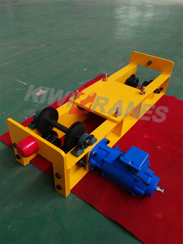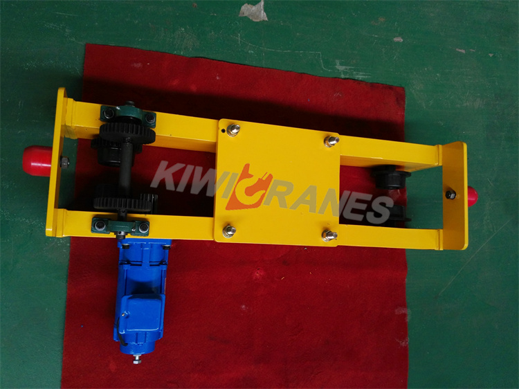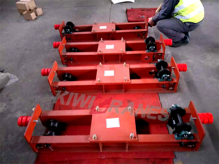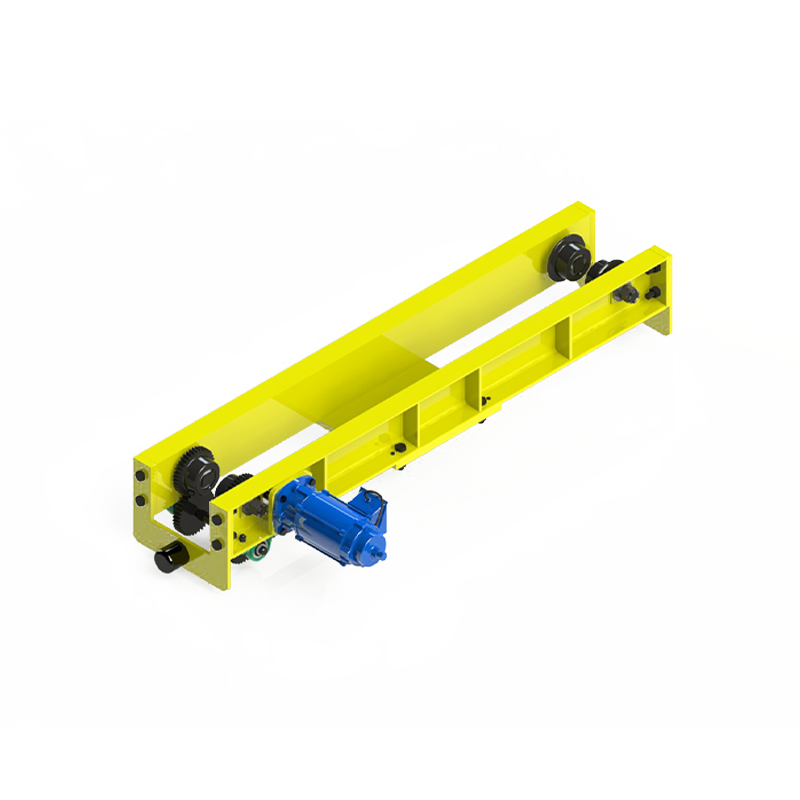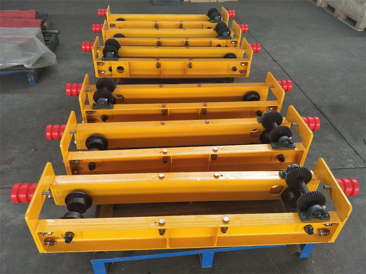 端梁車輪采用鍛鋼制作(45#),在車輪輪緣滾齒后經(jīng)熱處理工藝加工,保證車輪的輪壓及強度,配合我公司的KW系列軟啟動三合一電機,可實現(xiàn)軟啟動或使用變頻控制實現(xiàn)雙速;結(jié)構(gòu)使用高強度槽鋼焊接而成,端梁配備掃軌版,能有效清理軌道上的雜物使車輪在軌道上運行更加平穩(wěn),兩端配備聚氨酯緩沖塊,起重機運行至極限時可實現(xiàn)物理限位功能。